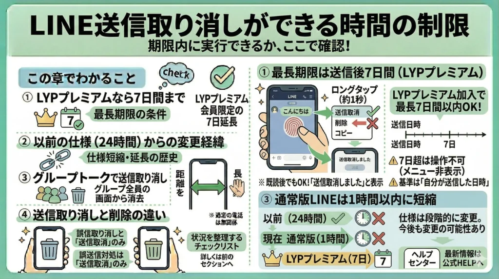 以前は、送信から24時間以内の猶予がありましたが、2025年秋の仕様変更でLYPプレミアム会員以外は1時間内に制限時間が短縮されました。