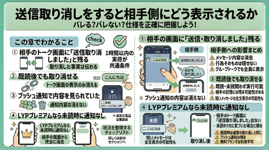 LYPプレミアムに加入している場合、相手がまだメッセージを読んでいない(未読)状態であれば、通知なしで取り消せる機能が利用できます。既読後の取り消しには通常どおり「送信取り消しました」の表示が残ります。
