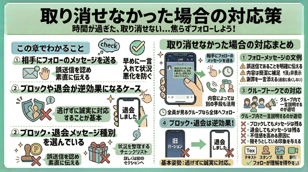 取り消せなかった焦りから、相手をブロックしたりグループを退会したりする行動に出てしまう方がいますが、これは多くの場合に逆効果です。