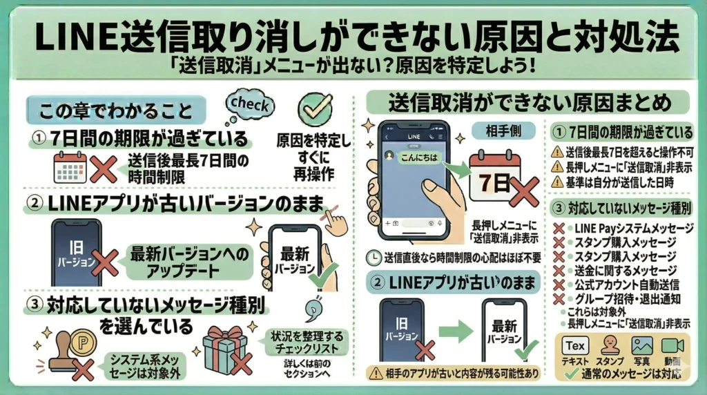 「送信取消」が表示されない主な原因は、期限・アプリバージョン・メッセージ種別の3点です。